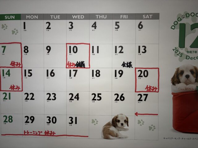 遅くなってしまいましたが…12月の休業日についてです。12月は7日(日)10日(水)14日(日)20日(土)がお休みになります。年末年始はドッグホテルは通常営業になりますが…ドッグトレーニングは12/27〜1/4までお休みになります。ご利用予定のお客様には大変ご迷惑をおかけしますが、よろしくお願いいたしますm(_ _)m
