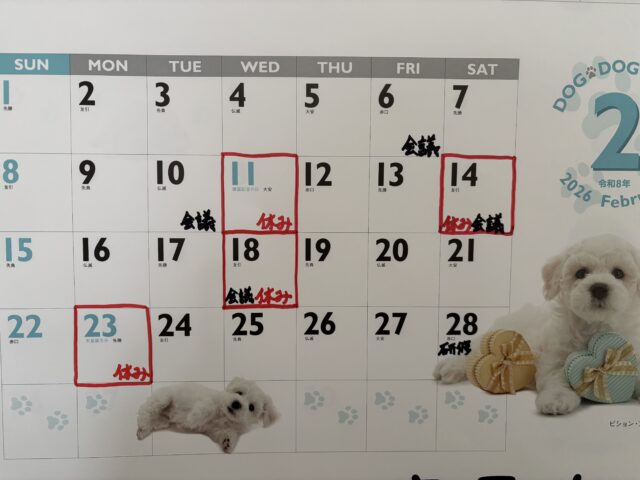 遅くなってしまいましたが…2月の休業日についてです。2月は11日(水)14日(土)18日(水)23日(月)がお休みになります。ご利用予定のお客様には大変ご迷惑をお掛けしますが、よろしくお願いいたしますm(_ _)m